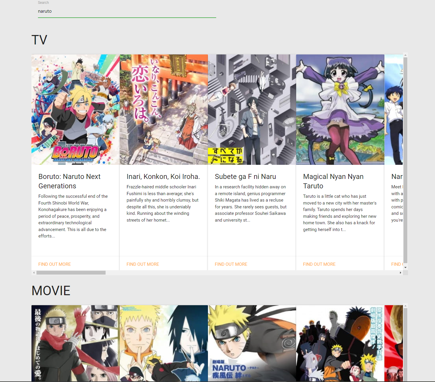 Animu is a platform allowing users to view anime information online. This was built so I could learn how to manipulate APIs. The most difficult part of the project was trying to sort each search query by show type such as TV or MOVIE. I am currently working on designs for future development of this project.